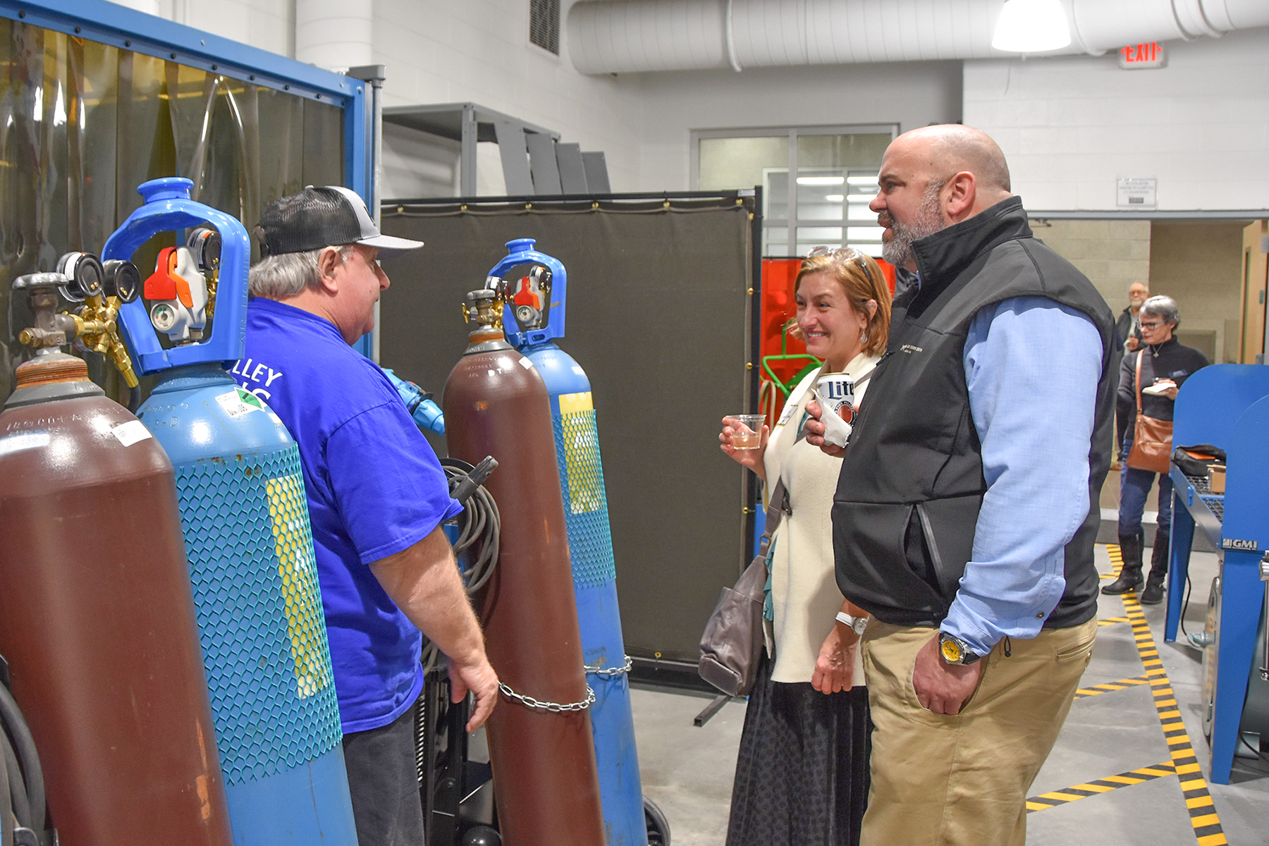 Business After Hours guests David Willey, Susan DeLazaro and Dan Walsh visit the welding booths in the Patricia and Alan Guerrieri Technology Center at Wor-Wic Community College.